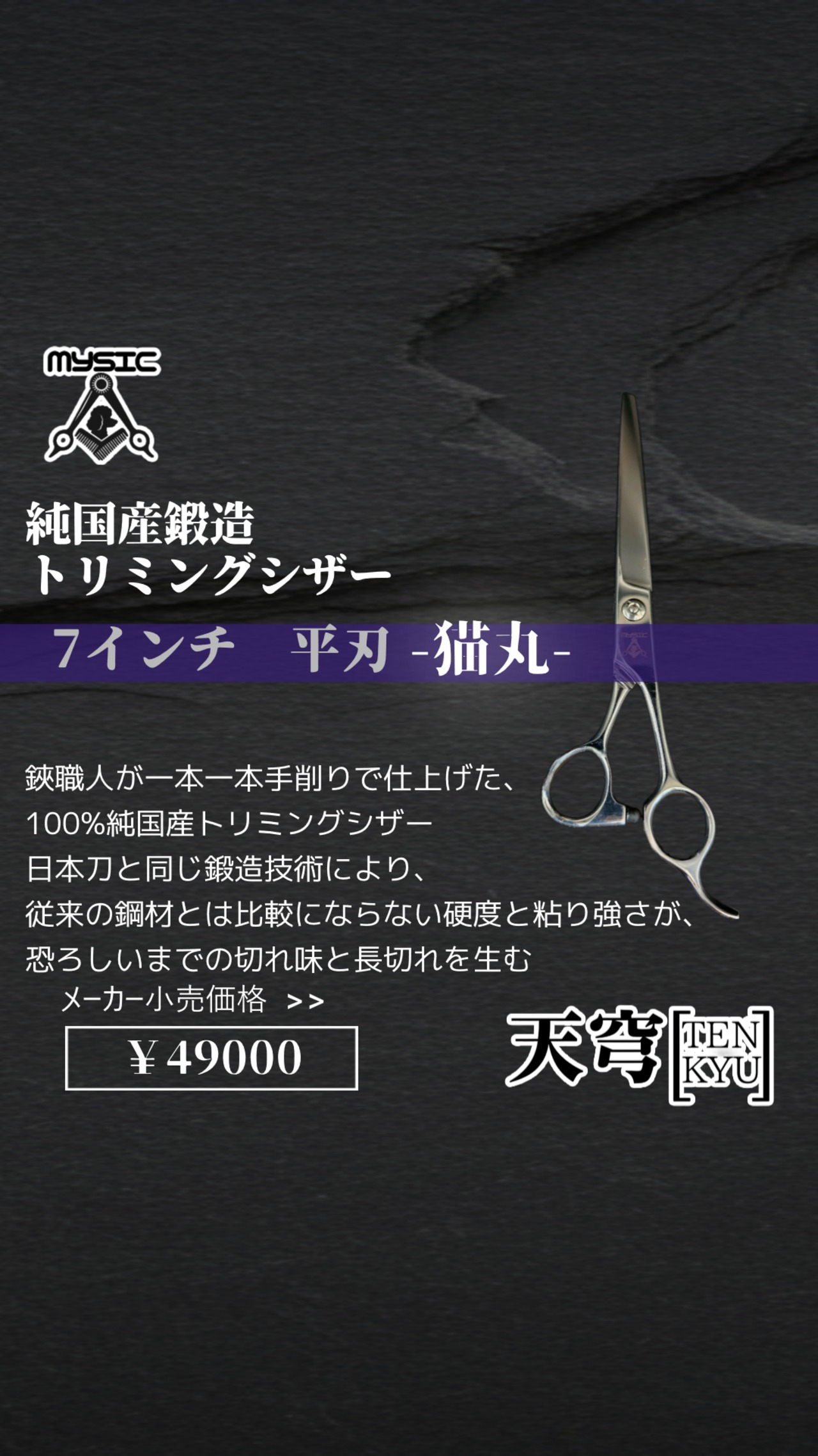 【MYSIC】天穹(TENKYU) ハイグレードモデル 純国産鍛造シザー 7インチストレート 平刃 "猫丸"